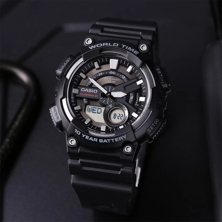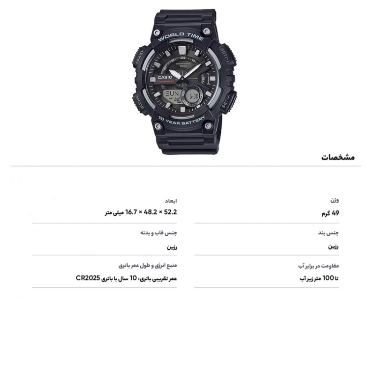 ظرفیت حافظه: حداکثر 30 مجموعه داده، با نام 8 کاراکتری و شماره تلفن 16 رقمی ساعت مچی اسپرت کاسیو مدل CASIO AEQ-110W-1A این ساعت دیجیتال با باتری ۱۰ ساله و مقاومت در برابر آب تا ۱۰۰ متر، انتخابی عالی برای استفاده روزمره است. دارای قابلیتهای مهمی همچون نمایش زمان جهانی، زمانسنج ۱/۱۰۰ ثانیه، Telememo 30، و آلارمها است که به آن کاربردی بودن و دوام بالایی میدهد. |